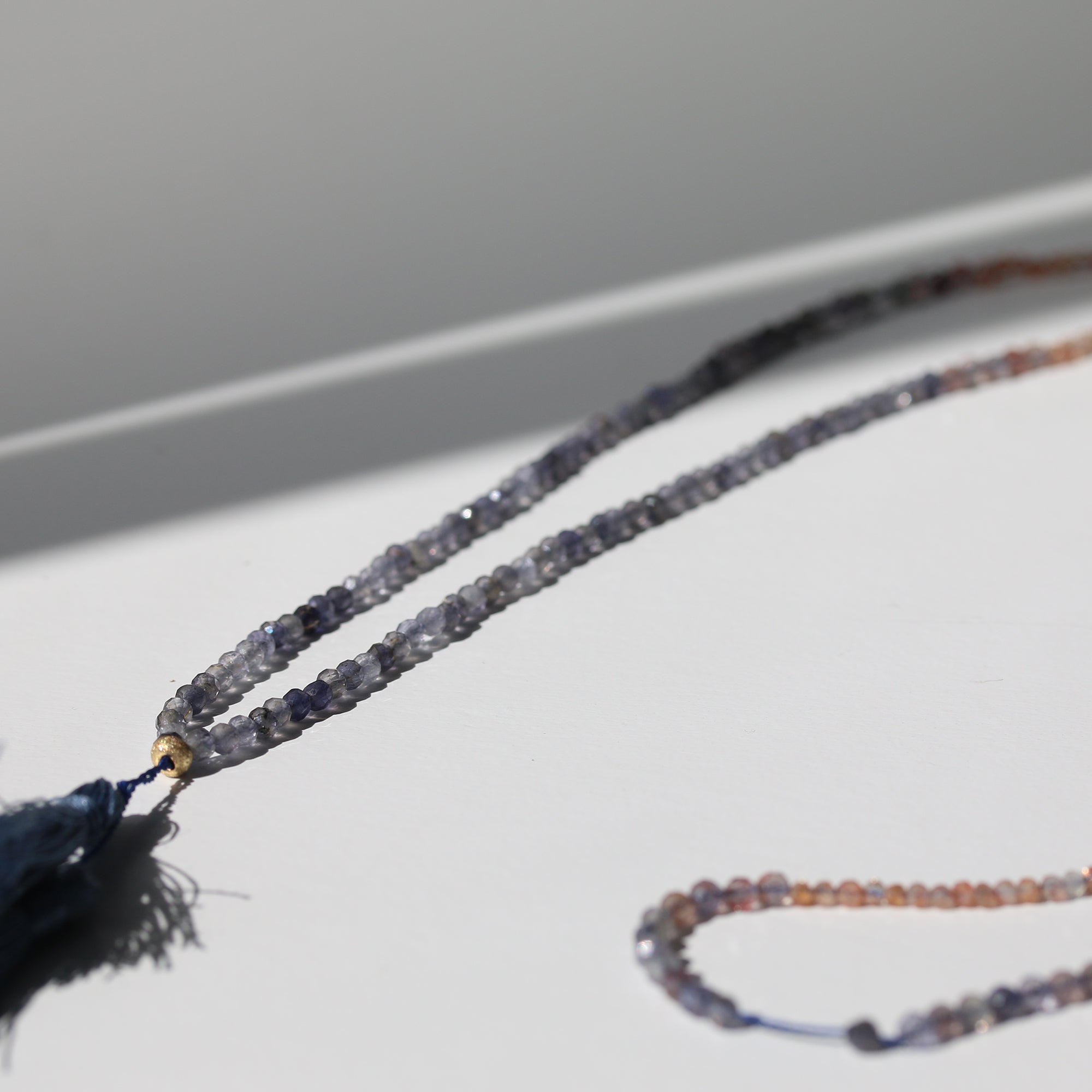 Inspired by moment twilight paints the sky in a gradient of deep blue fading into warm, fiery orange, the Autumn Sunset necklace blends the translucent deep blues of iolite with the glittering warmth of sunstone.