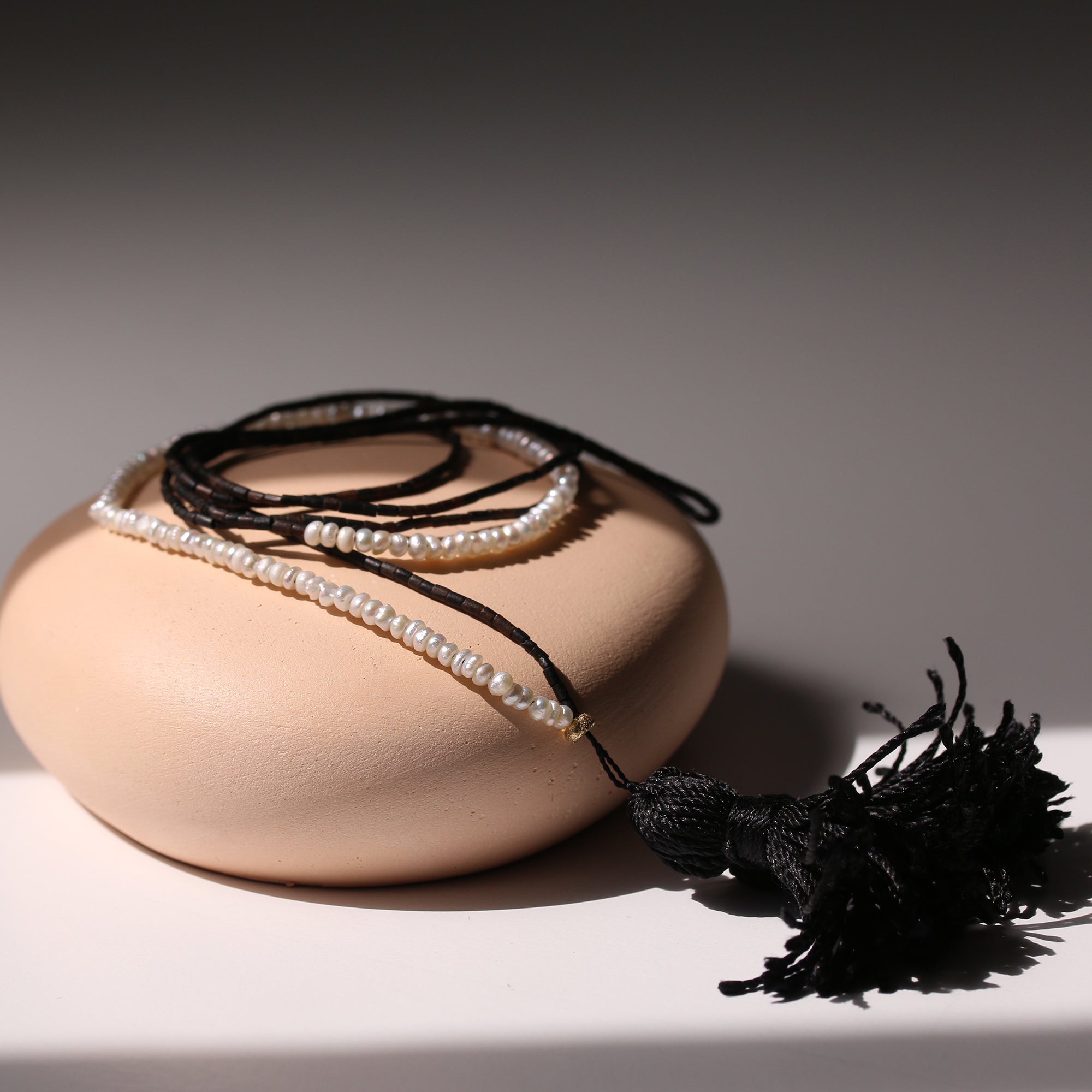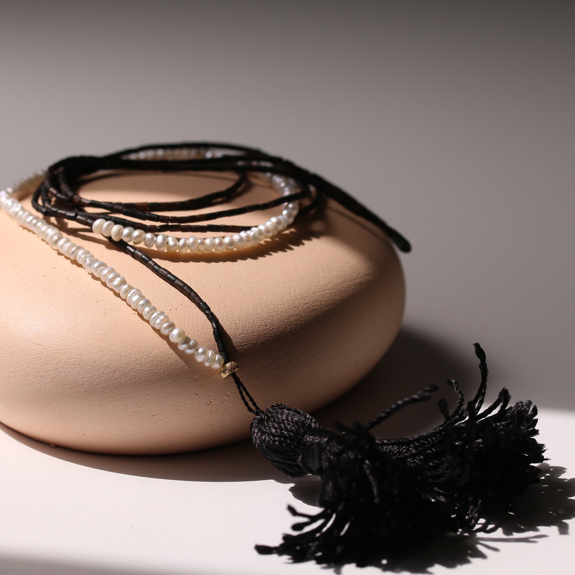 Inspired by Diane Keaton’s iconic blend of sophistication, wit, and bold individuality, the Midnight Reverie Necklace embodies her effortless confidence and timeless style. White freshwater pearls bring a touch of classic refinement, while matte black obsidian adds modern edge and depth. The result is a piece that feels both refined and unapologetically original, much like the woman who inspired it.