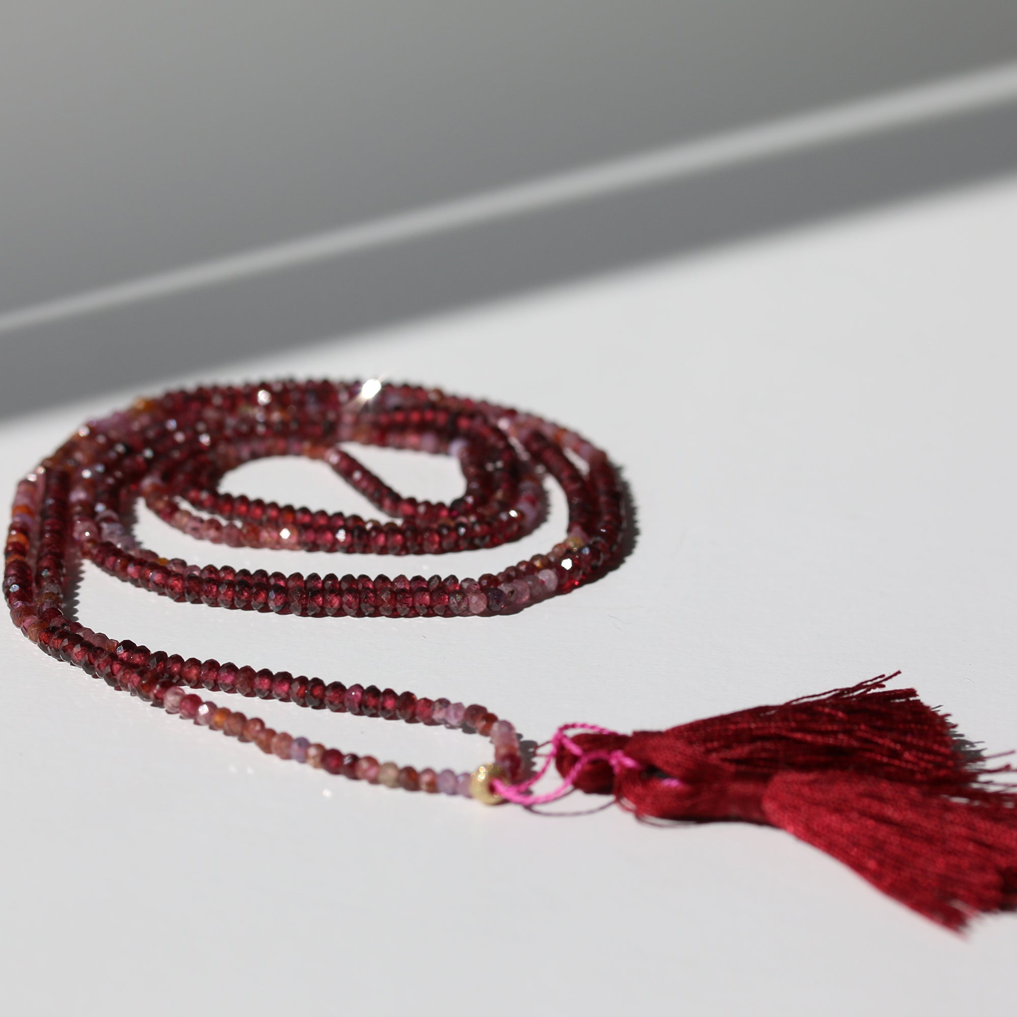 Inspired by the deep, rich, purplish-red color of wine infused with warm cinnamon spices of mulled wine, this necklace blends the translucent red hues of garnet with the bold pinks, reds, and purples of rubies.